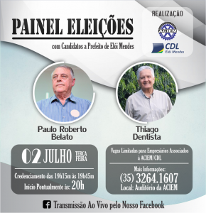 Associação Comercial e CDL promovem Painel com os candidatos a Prefeito de Elói Mendes, no dia 02 de julho, a partir das 19:15 horas em seu Auditório. Os convidados são os Empresários associados.